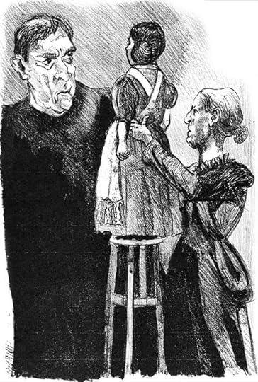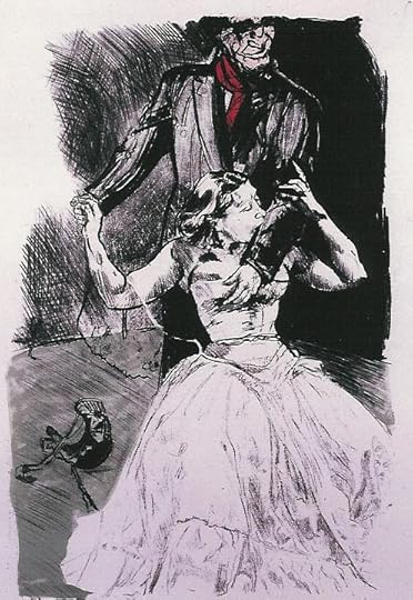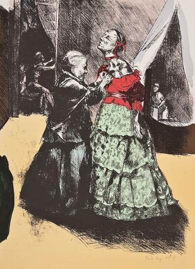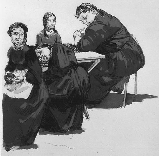 Paula Rego does not paint attractive pictures. If you are hoping for some conventional illustrations to a favourite Victorian novel, then this is not for you. She takes the gothic side, the horrific atmosphere underlying Brontë's work, as her starting point. Almost all Paula Rego's works feature people, and they are all breathtakingly direct. She has a very honest eye, and the ability to reproduce what she sees, and also impart her subjective emotional reaction within the work. Here she conveys the psychological drama in the book through distortions of scale, expressiveness of gesture and frown, and disturbingly stark contrasts of light and shade. On a first impression her work may seem ugly and cruel. The viewer may feel they are an interloper, watching a private moment, and want to look away. Paula Rego's works are not pretty, and they are often subversive, but they have a morbid dark truth.