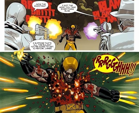 Not that there aren't things to like - the fight is taken inside Logan's head where there's a number of doors with various markings on them. Doors like "Reasons to hate myself" with "Doctor Rot was here" (a call back to Aaron's other Wolverine series, Weapon X - highly recommended by the by), "X-Men I've had sex with" and "how I cheat at cards". The light tone lifts the story up from the sober we-have-to-kill-wolverine-oh-no-we-don't storyline you expect. I also liked Fantomex and Dr Nemesis's back and forth when facing Wolverine: "Now the shooting!" "I got the head, you take everything else", "I suppose that's all the eulogy you're going to get. Au revoir, James"