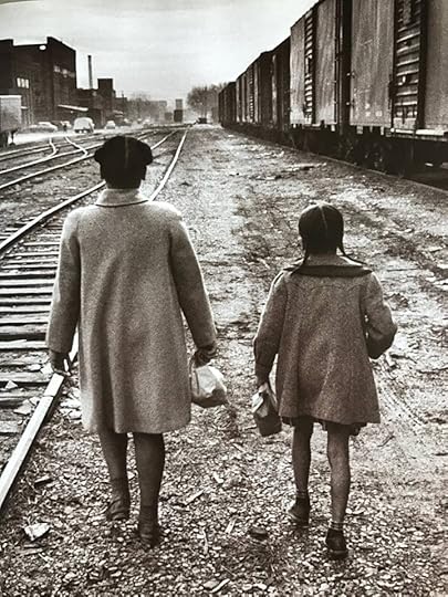 There are three photographs of segregated classrooms, each more sobering than the previous one. And the final image is the one which tugs at my heartstrings the most. It is of two girls with their backs to the camera. They are walking along a railway track to school in Topeka, Kansas, and each of them holds a lunch bag: