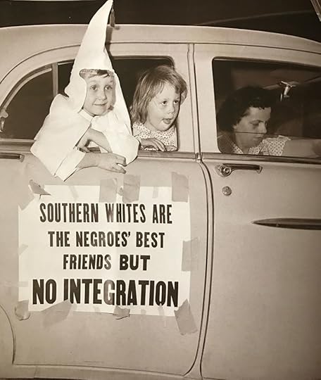 Some photographs show instances of stolid bravery, as one individual, or perhaps a few brave individuals defy the vilification directed at them as they walk to their school or college. One example is of Elizabeth Eckford, being harassed while walking to her school in Little Rock, Arkansas. She is part of the now famous “Little Rock Nine”. Another is the iconic image of tiny little Ruby Bridges being escorted to her first day at school by U.S. Marshals. It gets me every time. Many more cases like this are on record and their names will be familiar to most Americans. One image shows a group of black children and adults, accompanied by Toni Morrison’s comment,