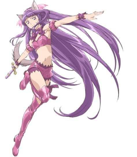 Her name is Zackuro (actually Pomegranate - it's not clear to me why some of the characters's names get translated and other don't). She's fused with a grey wolf. Her special power is a Ribbon Zackrus Whip which comes out of her metal cross. Pomegranate is super pretty, literally a signed model, and prefers to be alone - not surrounded by these little girls, especially sycophant Minty.