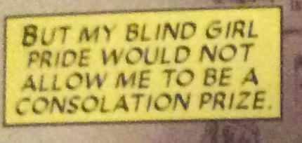 IT WAS HER BLIND GIRL PRIDE. That wasn't at all written by a white, ablebodied man! Listen, sighs. I'm not saying that Bendis was perfect, but he tried. During his run, he introduced Milla, reintroduced Becky Blake, who is now a lawyer and new partner in the Nelson and Murdock firm, and, of course, my lady, Echo. Reading it now, there are so many cringe-worthy moments dealing with disability, but Bendis made an effort to address it, even when he failed.
