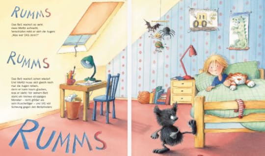 At the beginning of this story, little Moritz wakes with a start due to loud bangs. It turns out, a little ill-tempered monster is kicking his bedpost!