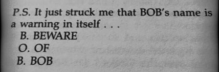 P.S. Un po’ mi spiace che, per forza di cose, nella traduzione italiana abbiano dovuto adattare diversamente l’avvertimento presente nel nome del malvagio. Dall’originale: in: B. BOB O. ORRIBILE B. BESTIA Se non ricordo male. A mio avviso potevano riportarlo così com’era, magari aggiungendo una nota per la traduzione a piè pagina.