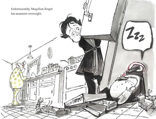 The very proper Elliot falls in love while on a visit to the aquarium. While his father reads his National Geographic, Elliot avoids the crowds of noisy kids at the other exhibits and revels in the appearance and antics of the penguins. When he politely asks if he can have a penguin, his father assumes that he wants a stuffed one, and provides the cash for it. Once Elliot and the kidnapped penguin he names Magellan have arrived home, Elliot does his best to make things comfortable for his new friend. In many ways, this delightful title reminds me of one my all-time favorites, Mr. Popper's Penguins from 1938, but it has such a sly kick to it that it has its own appeal. The insider references to Magellan and Captain Cook will remind many teachers and school children of the typical research projects assigned in middle grades. The illustrations, created with pen and ink, ink wash, watercolor, and colored pencil, are extraordinary. I love the pink flush on Elliot's cheeks and the stand-off between Magellan and Ms. Stanbridge, the librarian, who has likely seen sights much stranger than a penguin in the library. Reading this book was great fun!
