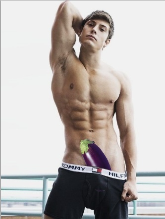 "He drops a hand to his lap and adjusts himself to make more room in his pants for that eggplant."