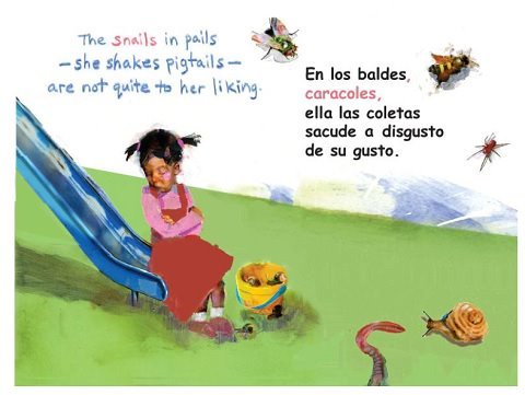 Each sentence also appears in Spanish, but without the clever rhymes. The rhymes in English are cute and read well. I’ll share a few pairs of pages. “The snails in pails are not quite to her liking”