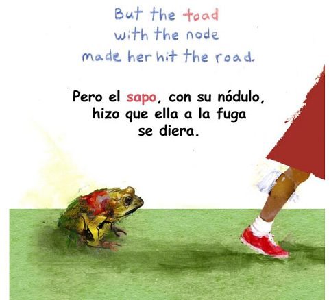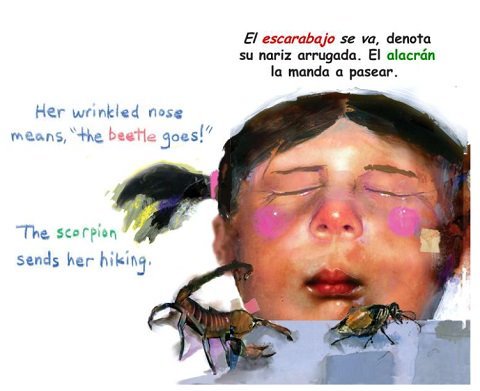 Note how the words are colour-coded to match in the two languages. “Her wrinkled nose means ‘the beetle goes!’ The scorpion sends her hiking.”