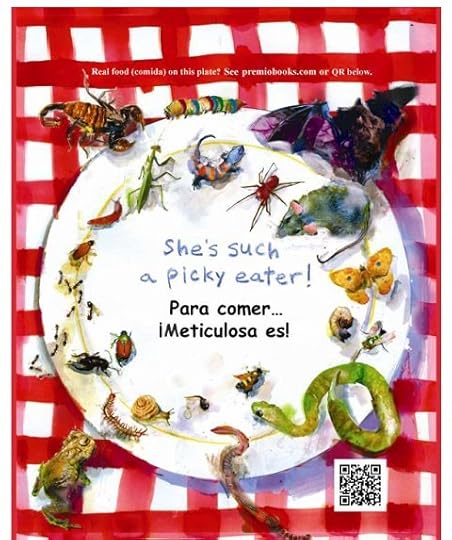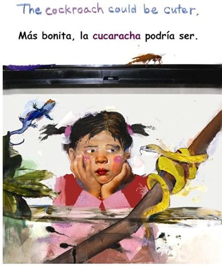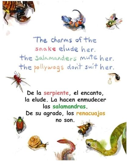 She doesn’t want the worms or (the Spanish translation) Ella No Quiere los Gusanos is a children’s book with some rhymes that sound kind a singsong-y when read in English. It is made up of English and Spanish writing on each page and is full of bright colors. It is also written on a level appropriate for toddlers. It follows a little girl through different things that are offered to her and her reaction to them. There are things like worms, bumblebees, spiders, beetles, snakes, salamanders and many more. The art is cute and bright and children will like the tones. The writing is simple and nonsensical throughout the story and preschoolers will enjoy this book. The Spanish part of this book doesn’t make much sense because rhyming was deemed more important than a meaningful translation. It will probably confuse a Spanish-speaking child or adult.