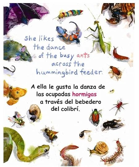“She likes the dance of the busy ants across the hummingbird feeder.”
