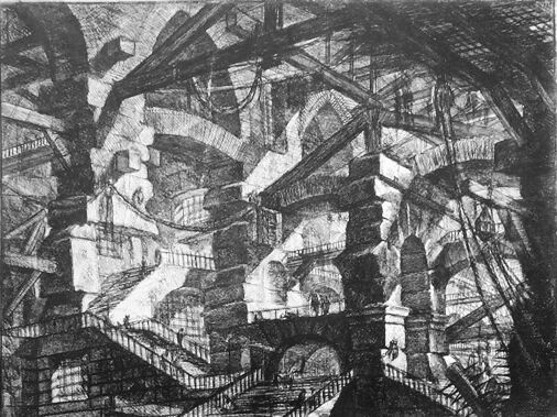 While staying in the concrete, on the concrete, Sinclair’s London-walk-mirrored-in-text turns into a fantasy of random information, added endlessly while following the traffic circling the historical nucleus of the city. The roads are connected, but form no coherent storyline, they just lead on and on, delivering details of meaningless encounters. In a way, the descriptions remind me of Piranesi’s gigantic architectural compositions: hyperrealistic in detail, scarily dystopian in content. Reality as a strange maze, leading nowhere.