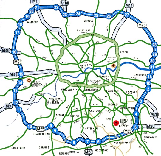 London Orbital by Iain Sinclair is an interesting counterpoint to Mrs. P's Journey by Sarah Hartley. It is part map and part memoir of the outer fringes of London where the M25 makes its 125 mile (give or take) loop around the city.