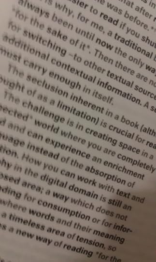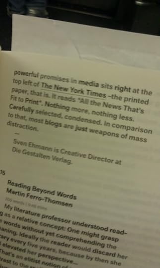 As for the meat: this is collection of over 80 short reflections (each one conveniently prefaced with an estimated reading time - - rarely more than 2.5 minutes) about such issues as the impact of technology and digital consumption on reading, the validity of web surfing as “reading”, and the modern necessity of being able to effectively “read” ads & images. Most of the pieces are very optimistic about the continued relevance of reading & literacy, even if they’re practical about the inevitable technological developments that will affect them. The essays are brief & personal (sometimes very impressionistic or even offhand) affairs. Some I loved, some I disagreed with very much, many were, to be honest, fairly “meh”. I’d recommend at least perusing this on account of the innovative design, and if you’re deeply interested in the future of the practice of reading, I’d say go ahead and give it a gander, but it’s nothing truly profound or groundbreaking.