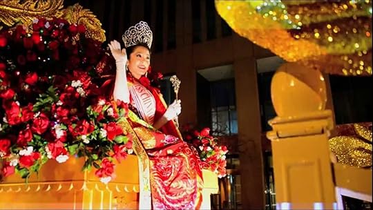 Next, is the Miss Chinatown float made to look like a giant swan with Miss Chinatown in the middle, tossing candy at the crowd. Suddenly, there are more fireworks and while everyone is looking up, Miss Chinatown disappears. The parade comes to a stop, Holden, Josh, Dink and Ruth Rose all clamor on to the float to see what happened. All they see in the box Miss Chinatown was standing on, but Dink notices a piece of black sticking out from under it and when they lift it up, sure enough, they find Miss Chinatown, Lily Chen, but her crown with the valuable ruby is missing.