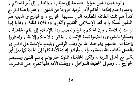 -ثناؤه العجيب على فئة منحرفة كالخوارج وأسماهم بـ"الفئة المظلومة" وأنهم هم من تمسكوا بالخط الإسلامي القديم وأنكروا المُلك وتمسكوا بمبادئ الحاكمية وأنهم أرادوا إعادة الأمة إلى الجادة وأنهم هم "دواخل الأمة" ولا يصح تسميتهم بالخوارج وهو بهذا متناسياً مواقفهم وما فعلوه وما كانوا عليه من فساد الأفكار وفهمٍ خاطئ للقرآن والسنة كتكفيرهم لمرتكب الكبيرة، وكيف هم بدواخل وهم من انحرفوا عن المسلمين وقاتلوا المسلمين في مواطن عديدة وارتكبوا الفظائع في خلافة علي رضي الله عنه ، وهل نسي كاتبنا حديث الرسول صلى الله عليه وسلم فيهم وإخبار صحابته بأمر هذه الفئة التي تمرق من الدين كما يمرق السهم من الرمية ؟!