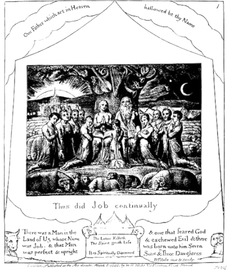 Blake's assertion that Job's initial God is a god of his own making is reflected in how similar to each other Job and God look. Blake sees satan not as a literal being who would show his own folly at the expense of a mortal, but rather as the Accuser within Job's own mind. Much of Blake's interpretation of the story is surprisingly psychological and metaphorical. I say surprising because, given that Blake is a Romantic, us contemporaries would assume that psychologizing is something done by modernists of a more scientific and rationalistic bent, rather than a romanitic. Essentially, this book gives more nuance to our view of those two groups.