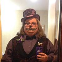stacey outfit: -"Today she was wearing floral leggings, a pink shirt with big sleeves, and a long vest covered in antique pins. A black fedora with a red cloth rose was perched on top of her shoulder length hair."