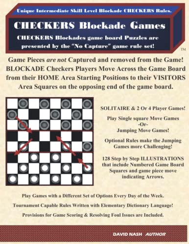 Blockade CHECKERS focuses on the elements of strategy and game piece maneuvering techniques. A Player's HOME area squares are also the opponent's destination, VISITORS area squares. Players move game pieces from their starting positions, the HOME area squares on one end of a Checker board to their VISITORS squares on the opposing end or corner of the game board. Three Essential Rules make playing these "No Capture" Games on a Checker Board with a limited number of empty spaces available for maneuvering game pieces Possible! The resulting Blockade CHECKERS gaming experiences have unique strategies to discover, and although not a game of Chance, funny surprises may occur! The "Blockade No Forward Moves" command that is called out at the beginning of a turn before making a game piece move is a necessary game feature! When a Player Calls Out "Blockade" Normal turns to make a move become Paused while all of the Player's opponents make a specified Blockade Removing Move. When the Paused game play begins again, the Player that called out "Blockade" resumes their normal turn to make a move. Two and Four Player games must have a "Vacate " command. A Backward Move Option Rule must be available also. Meeting the backward game piece movement Rule requirements enables a Players ability to Call Out "Vacate My VISITORS Area"! "Vacate" is called out at the end of a Players turn to make a move. After "Vacate" has been Called Out by a Player, All of the other Players turns to move a game piece become restricted. Making qualifying Vacate a VISITORS Area game piece movements becomes the only way to take a turn to make a move! A new opportunity for taking a normal turn to move a game piece becomes available if another Vacating move requirement is not being imposed by any of the Opponents. Causing Blockades, setting up and repeating Vacating Move Traps and Isolating game pieces are Two and Four Player Blockade CHECKERS Game Strategies. However, a player must plan ahead and allow for good game piece positioning during the end game or else their game pieces will start to incorrectly assemble on their VISITORS area squares! Effective strategy, must be coupled with efficient game piece maneuvering techniques for good Point System Scores while playing Sets of Solitaire games and during Competion in a Two -or- Four Player Game. Solitaire Blockade CHECKERS games are played without the presence of an opponent's strategy tactics. Therefore, the Vacate My VISITORS Area rule set is not required during a game of Solitaire. When playing Two Player and Solitaire games a WHITE game piece is moved first, a BLACK game piece must be moved after every move that is made with a WHITE Game Piece! To Win a game of Solitaire, complete the occupying of WHITE's VISITORS area squares. A Solitaire Player's game is Declared a Winner when BLACK's VISITORS area is simultaneously occupied after the completion of the last, game ending BLACK Game Piece move! Similarly, a competitive game that ends in the same way as a Winning Solitaire Game does is also a Two Player Game Tie Score! Essential Rules, Explanations, Game Variations and Examples with 128 corresponding Illustrations are in the 8.5X11 inch, 128 Page Blockade CHECKERS book. Illustration Dialogue and the corresponding Illustration appear on the same page. The Illustrations feature Number plus Letter square identification and game piece movement indicating Arrows. Chapters for Single move, Jumping move, and Four Player games, are included. Choose larger or smaller game boards for more or less challenging Games. Game Board Illustrations in the front and back cover areas can be used for playing Blockade CHECKERS games on the following Checker board sizes, 6X6; 6X8; 8X8; & 10X10. All of these Tournament Capable Rule explanations are written with Elementary Dictionary words. Point sytem Scoring, Foul Resoloution and Junior Player Handicapping recomendations complete the book!