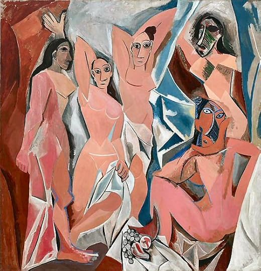 The image is simple. Five naked women disport themselves in various poses with a bowl of fruit in the foreground. The manner of realization is far from simple and is surprising, even today. Staccato, zigzag and arching lines make for a wild rhythm that takes over the whole picture surface. All traces of perspective have been eradicated. Flaring white brushstrokes shatter the tonal coherence of the painting. The art-historical discussion of sources and influences has been largely short-circuited by the idea of an unholy marriage between Cézanne and African art, even though the most cursory glance reveals nothing of Cézanne and only the occasional detail that might be said to be African in feel. The truth is—and it is evident throughout the painting—that there are many conflicting points of reference for the painting. Picasso was trying to recover the primordial life force through painting, and he looked to many so-called 'primitive' sources for his inspiration: Assyrian stone reliefs; funerary carvings from the early Athenian period; Boeotian bronzes and Cycladic figurines as well as African tribal sculpture, masks, and fetish figures.Thompson's style ranges from the verve of "Staccato, zigzag and arching lines make for a wild rhythm that takes over the whole picture surface" to the gauche repetitions of the word "painting." But his information is potentially valuable; it would be more so if he backed up his dismissal of Cézanne by reference to some other page in his book, or if most of his readers had any idea of the "primitive sources" he lists at the end. He would be good at sparking discussion with graduate students, but as an introductory exposure to the basics promised in the title, his notes miss the mark.