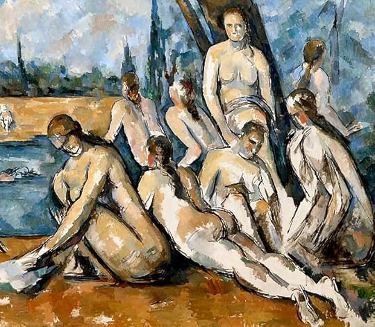 With its hacked countours, staring interrogatory eyes, and general feeling of instability, Les Demoiselles is still a disturbing paining after three quarters of a century, a refutation of the idea that the surprise of art, like the surprise of fashion, must necessarily wear off. No painting ever looked more convulsive. None signalled a faster change in the history of art. Yet it was anchored in tradition, and its attack on the eye would never have been so startling if its format had not been that of the classical nude; the three figures at the left are a distant but unmistakable echo of the favourite image of the late Renaissance, the Three Graces. Picasso began it in the year Cézanne died, 1906, and its nearest ancestor seems to have been Cézanne's monumental composition of bathers displaying their blockish, angular bodies beneath arching trees. [See detail below]