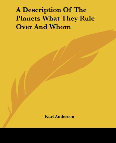 ""A Description of the What They Rule Over and Whom"" by Karl Anderson is a comprehensive guide to the astrological significance of the planets in our solar system. The book explores the characteristics and traits associated with each planet, and how they impact different aspects of our lives, including love, career, health, and spirituality.The author delves into the mythology and symbolism of each planet, providing a rich understanding of their influence on human behavior and destiny. The book also includes practical advice on how to harness the power of the planets to achieve greater success and fulfillment in life.Whether you are a seasoned astrologer or a beginner, ""A Description of the Planets"" is an invaluable resource for anyone seeking to deepen their understanding of the cosmos and its impact on our lives. With its clear and accessible writing style, this book is sure to become a beloved reference for years to come.THIS 38 PAGE ARTICLE WAS EXTRACTED FROM THE Astrology of the Old Testament or the Lost Word Regained, by Karl Anderson. To purchase the entire book, please order ISBN 1564599302.This scarce antiquarian book is a facsimile reprint of the old original and may contain some imperfections such as library marks and notations. Because we believe this work is culturally important, we have made it available as part of our commitment for protecting, preserving, and promoting the world's literature in affordable, high quality, modern editions, that are true to their original work.