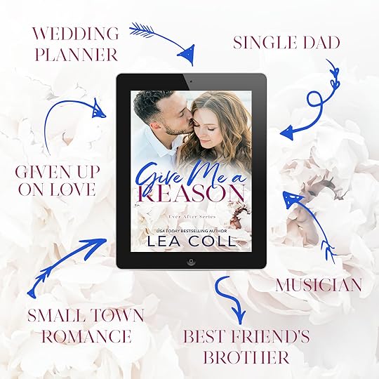 Give Me A Reason is the fourth book in Lea Coll’s Ever After series, a spin-off of her Second Chance Harbor books. It focuses on business owners and friends (sometimes frenemies) working together to make beautiful weddings a reality. It’s a complete stand-alone title, but as a self-proclaimed big fan of this author’s books, I highly recommend reading all of them in order.