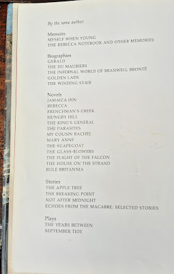 As a few commenters stated they didn't know Daphne du Maurier wrote any nonfiction. I thought I would include a screen shot of the book listing her books. She wrote many about Francis Bacon, I suppose her big interest, as well as memoirs.