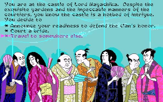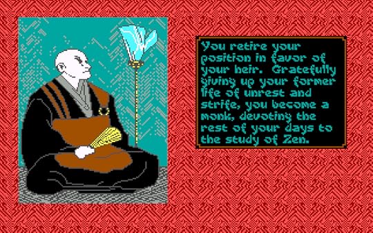 so actually this rambling, disjointed, unorganized "book review" or "good reads book entry" is actually making a subtle point. because Sword of the Samurai was designed in 1989. it used primitive 16-color graphics with the pixels 1 mm by 1mm, and MIDI one-tone sound. (just to listen to the soundtrack today is painful). but despite all these limitations, SS has become legendary in the game-design field because of its ability to inspire replay. there was a lot of skill, but there was also a lot of chance: you had to learn the little sword-fighting game; the bandit and small map fighting game; and then finally the large unit fighting game. but even assuming everything went right, there was also the possibility that you would ascend to lord of your province just in time to learn that the next door provinces were quite strong and powerful, a sure recipe for losing the game at that stage. whether you languished as a medium rank samurai, ascended to the lord rank, or actually became shogun, the game felt real and playable.