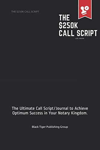 - ( 6 x 9 ) inches - 121- Half *Ruled Notebook, Other Half *The $250k Call Script Tiger Toledo is an Entrepreneur, Author (Amazon's #1 New Release and Top 20 Best Selling Author with 'Rise of the Smart Notary'), and owner of a Nationwide Notary Agency "U.S Notary Agency".Tiger has coached notaries/NSA's over the last few years and has met some wonderful notaries all across the United States. He noticed one commonality amongst the notaries... many of them didn't know how to give their notary business a big company feel.In this T.I (Telephone Inquiry) logbook/notebook Tiger pulls the curtains back to share with you one of his secret sauces to success. The $250k Call Script has allowed him to take his one-man notary public show and make it into a national company in 1 year. Some great benefits that result from using The $250k Call BetterDon't sound like an amateur sales professional or a telemarketer.The $250k Call Script allows you to sound more prepared, professional, knowledgeable, and polished.*Better ImpressionYou will make a better impression when speaking with sales prospects when you sound better. This will allow you to improve your ability to establish conversations and have a good flow within the call as well as make a better impression.*More Productive The $250k Call Script will allow you to ask key questions also, share key points to trigger interest.If you choose not to use a The $250K Call Script, don’t be surprised if you find yourself skipping key steps that you need to take to be productive.*Better ResultsYou make a better impression, you get more out of each call and you will be more likely to produce better results when you sound better. It is more likely that you will achieve more during your conversations with prospects when using call scripts. This is whether you are trying to generate leads, schedule appointments, or close deals.Decrease StressAn important benefit of using call scripts is that you decrease stress and cold call anxiety. It is very challenging mentally to conduct sales and make cold calls. This is due to never knowing what direction calls are going to go and you always face the possibility of rejection.The level of stress is decreased by decreasing your level of uncertainty on what to do when using sales scripts. If you replace that with a clear plan of what to say and do, The $250 Call Script, will turn stress into confidence. Improving the mental aspect of sales calls improves your results and improves your stamina for performing your job on a regular basis.
