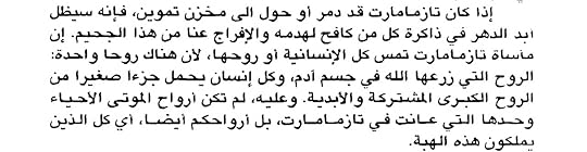 عندما أفكر في السجناء المرضى , الحمقى الذين تركتهم ورائي في السجن وأشاهد على الشاشه المذابح التي يرتكبها الأقوياء ضد الضعفاء في البوسنه والهرسك وارى المأساه الفلسطينيه والمآسي والحروب الأهليه والدينيه والأيدلوجيه , أقول إن العالم أضحى تازمامارت كبيره دون أن يدري ذلك !