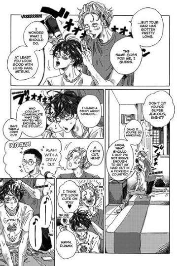 I'd still like more focus on the characters than the travelling but it's got a better balance in this volume. It's still not the end, but I liked the character growth better. Asahi actually came out to his brother and we got to see a little bit more of Paul. There was minor stuff flashing back to Asahi's previous illness and a little bit of his mother, which was nice. I do kind of feel like Mitsuki is lacking the same depth and background as Asahi. He seems more one-dimensional, like his entire life revolves around Asahi and his came, and he has little else.