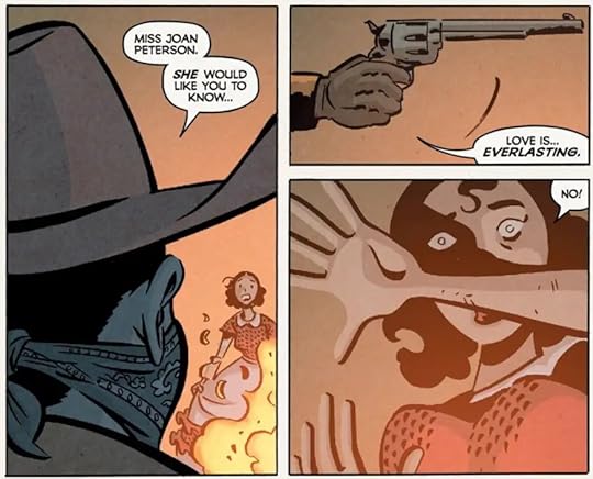 Joan Peterson pops up in one overwrought romance after another like Scott Bakula in Cloying Quantum Leap. Every time she refuses the marriage proposal, ranchhand Bill appears, tells her that love is everlasting, and murders her. ----------------------------------- Five issues in I still don't know what's going on, but I am enthralled. Is it an oblique examination of real world violence against women by exes and spurned suitors, a peek inside the heads of men who can't handle the word No? If so, the approach is brilliant.