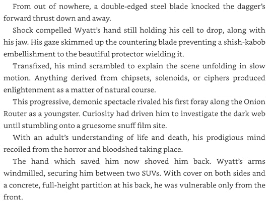 Following Reily’s progress as a writer, it is laudable to note her ever-expanding literary finesse: her ability to weave bizarre, suspense-filled romances continues, and her fluency with language grows. Note the opening: ‘Each flip of the key ring around his index finger tallied another reason to quit the world of high stake’s business. Work stemming from a far-fetched theory had taken form and flourished beyond his imagination. Unlike the soundless steps of his bodyguard’s booted strides, Wyatt’s tennis shoes pealed squishy squeaks through the dimly lit parking garage. “Adam, this does not make my list of top favorite places to visit Next time I help an old college friend, maybe we could pick a drier day and find parking other than a creepy garage. A rat skittered across the floor in the shadows, its gimlet-eyed stare marking the intruders’ positions. Air redolent of filth, gas, and pizza from a nearby restaurant clogged Wyatt’s sinuses, reminiscent of the alley apartment occupied during college. In those lean ears, digital fluency and had work had jettisoned him to the top of his field...’ Reily’s ability to create credible psychic situations is obvious.
