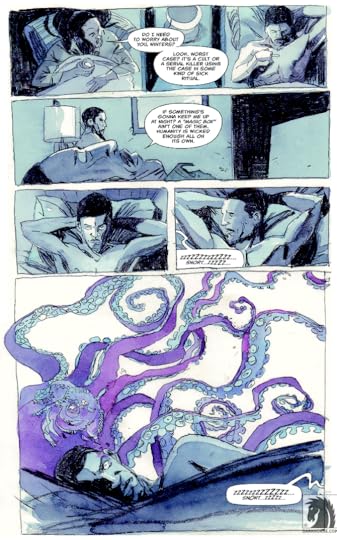Compré esta novela gráfica sin tenerlo previsto. No la conocía ni había oído hablar de ella aunque me llamó la atención y no deseaba irme de vacío. Me he encontrado con una historia policíaca con tintes sobrenaturales muy en la línea de la serie "True Detective". Un cuento demasiado breve, es cierto, pero repleto de matices, sugerencias veladas y polifonía de interpretaciones. La ilustración no de mi gusto: estilo boceto en color pastel de línea nerviosa; en ocasiones, los rostros son demasiado parecidos entre sí y me ha llevado a confusiones entre los dos personajes principales. Creo que hubiera dado para muchísimo más pero ha sido una grata sorpresa y me alegra tenerlo en la estantería. Muy bien editado en tapa dura por Planeta Cómic.