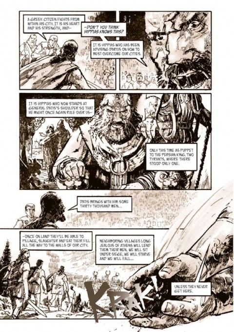 The narrative itself is very action-packed, yet sometimes can become muddied by the sketched art style and the limited color palette of black, white, and brown. There are times when the artwork can become confusing as to what certain panels are trying to portray, but for the most part the sketched art style is fantastic. Action within the story is incredible and the art accentuates the dramatic power behind each sequence on levels worthy of both the Greek Epic and graphic novel genres. Eucles' journey is an incredible feat that is done justice in this story, done so well you almost wish there was a soundtrack to the whole graphic novel, or even wish that this would be made into a movie. I know I'd love to see this story become a Hollywood blockbuster! A strong protagonist, a tyrannical antagonist, and a plethora of unique characters out of historical fame, Marathon is a truly awesome read.