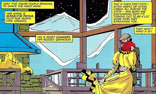 I love Maddie. She’s likable and very patient with the lunacy coming into Scott’s orbit brings her. She remains patient and kind to various reactions and cases of mistaken identity by the X-Men, even as it’s obvious that it starts to make her uncomfortable. Then, when Scott finally decides to take the direct approach— after a whirlwind romance of being hot and cold which ends in a proposal— Maddie’s reaction is gold.