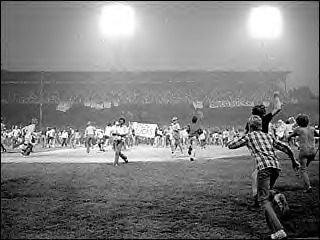 Almost immediately after this detonation, a stream and then a gushing wave of longhaired attendees flowed onto the playing field…The revolution, the pointless, hysterical revolution, had come. Some lit bonfires in the outfield. Some wheeled the batting cage around like it was a stalled car that needed a running start. Some performed hook slides and headfirst Pete Rose plunges into where the bases would have been if they hadn’t already been ripped from the ground and stuffed between giggling rib cages and the fabric of Led Zeppelin and Aerosmith T-shirts. More than one person reported seeing couples fornicating…”