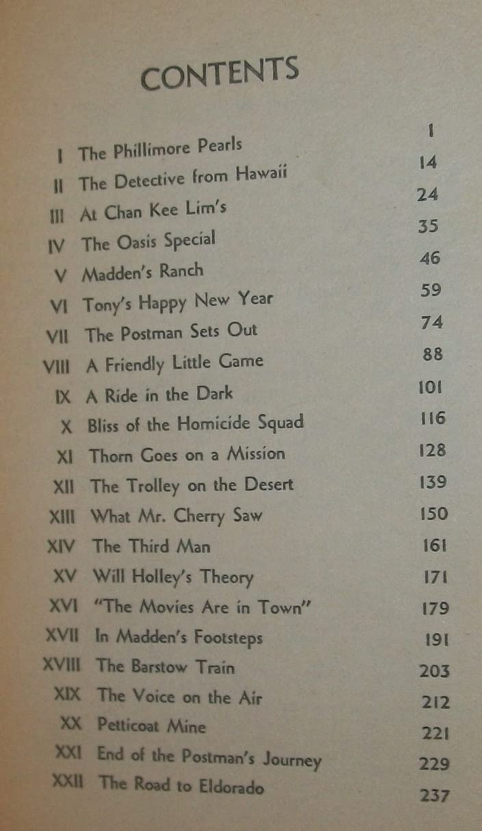 A secretary, a gambling house, a dead man's clothes, and a second murder with a tangible body make up a complex and confusing mystery which has Charlie and Bob Eden stumped, not to mention the reader. Reporter Will Holley becomes an ally but just when they think they know who was killed at the ranch, and why, their theory is turned upside down and there seems to be no course of action but to hand over the pearls.