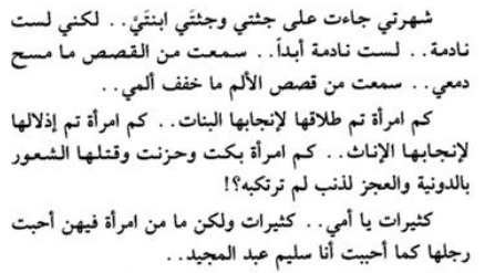 ثانيا عند قرائتي هذه الرواية منذ بدايتها أردت ان افهم لماذا امينة تريد رجلا فقد كان لديها الرجل المثالي ثم حين علمت انها لم تنجب ذكرا حسبت اني فهمت لماذا هي تريد رجلا ولكنها ارادت رجلا حقيقيا يقف بجوارها ويساندها في ألمها