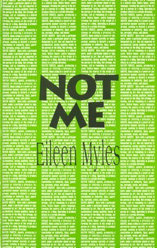 § The first time around Not Me, these poems provided me with a scaffolding that provided me with some level of discomfort given some of my own attitudes of a political nature. Let me explain. Firstly, this scaffolding appeared in my initial reading as a kind of poetic ledger testifying to the female’s bleak state or social position in the world, but perhaps more specifically, in American social constructs. I became hesitant of what I was being told: I thought identity politics was again being flogged to death by an insistence for recognition in the social sphere. I’m not insensitive to the plight of identity politics, but rather weary of its societal implications to bind ourselves to a fixed idea of ourselves exclusive of others. But as my reading intensified, I noticed a glimmer of something more complex than the whiny body of self-declarative assertions of self and outspoken sexual preferences. As in the poem, “A Poem,” “Life is a vow that frightens as it deepens.” The vow that Myles imagines is embedded in the poems almost peripatetic quality, where as Robert Creeley once said, the poet thinks with the poem. Here, Myles walks us through her poems, while enacting that walking through the poems themselves.