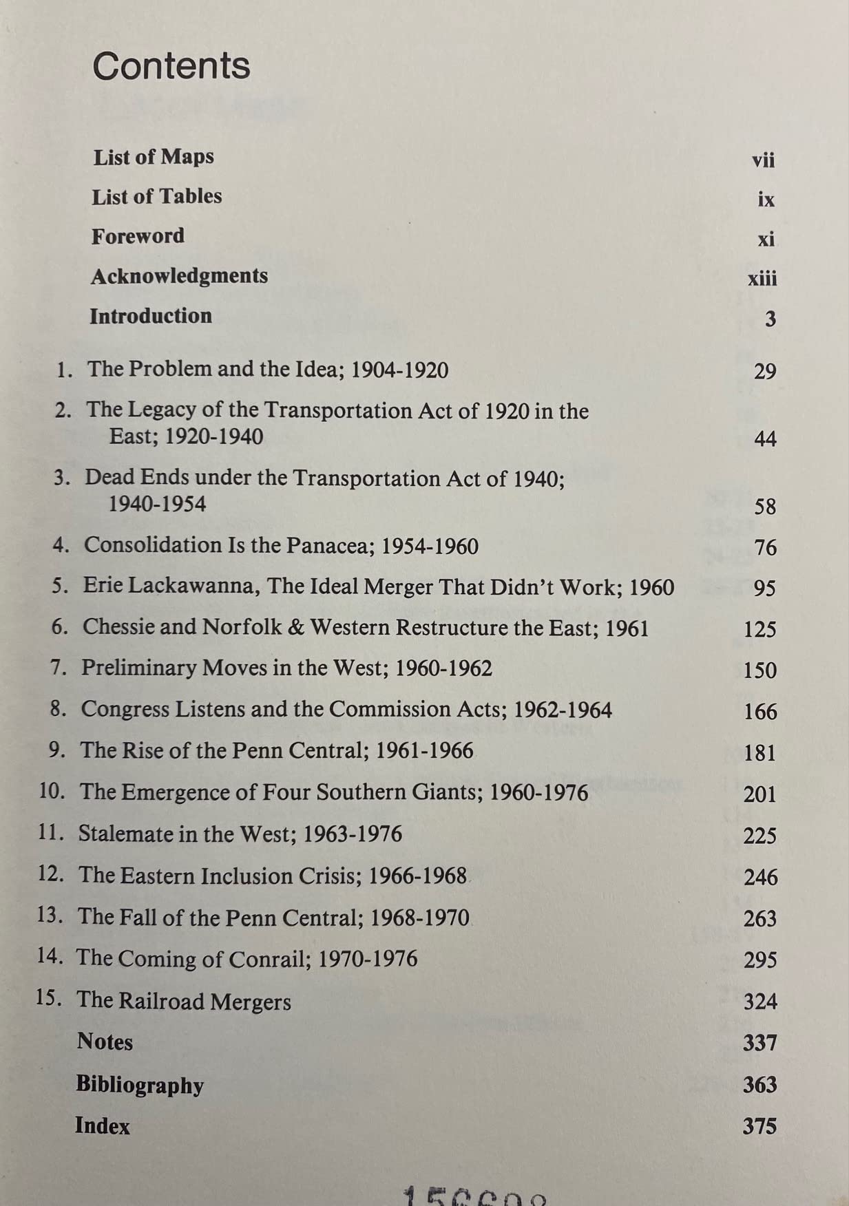 TABLE OF * List of Maps * List of Tables 1.) The Problem and the Idea; 1904-1920 -- 2.) The Legacy of the Transportation Act of 1920 in the East; 1920-1940 -- 3.) Dead Ends under the Transportation Act of 1940; 1940-1954 -- 4.) Consolidation Is the Panacea; 1954-1960 -- 5.) Erie Lackawanna, the Ideal Merger that Didnâ€t Work; 1960 -- 6.) Chessie and Norfolk & Western Restructure the East; 1961 -- 7.) Preliminary Moves in the West; 1960-1962 -- 8.) Congress Listens and the Commission Acts; 1962-1964 -- 9.) The Rise of Penn Central; 1961-1966 -- 10.) The Emergence of Four Southern Giants; 1960-1976 -- 11.) Stalemate in the West; 1963-1976 -- 12.) The Eastern Inclusion Crisis; 1966-1968 -- 13.) The Fall of the Penn Central; 1968-1970 -- 14.) The Coming of Conrail; 1970-1976 -- 15.) The Railroad Mergers -- * NOTES -- * BIBLIOGRAPHY -- * INDEX