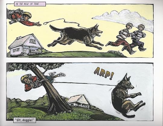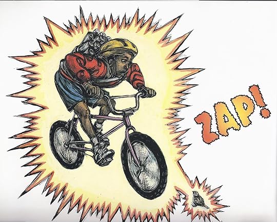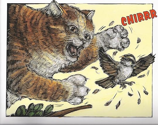 This story is presented partly in double- and single-page spreads, and partly in comic strip panels, as a young paperboy is zapped with sparrow power and defends his neighborhood against bullies--human and animal. The illustrations were rendered in scratchboard, transparent dyes, and gouache. They are energetic and do a great job of moving this humorous and satisfying story forward.