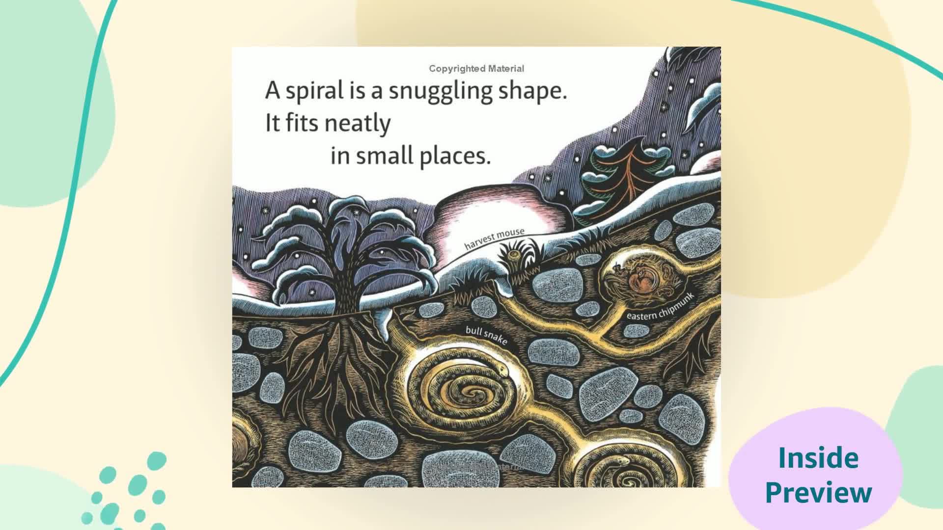 Love this book. Ordering my own copy. Sidman and Krommes bring to life how we are surrounded by spirals in nature and how those spirals serve many different purposes. Simple text and detailed illustrations require young reader or listener to think carefully about what is being said. At the end of the book, there is a clear definition of a spiral (a shape that curls around a center point) with an explanation of the spirals in the illustrations in the book. These last two pages should be read aloud to children as well.