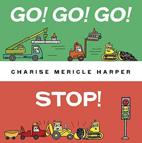 Eff it, I'm giving it 5 stars. Harper achieves so many things in this highly attractable book. One day, Little Green says his first word: go. Excited to share his word with the world, he bounces inside of an empty stoplight and shouts it for everyone to hear. Waking from their naps (holding adorable things such as a blanket and teddy bear), the construction vehicles wake up and zoom to action. Little Green persistently keeps shouting "go, go, go!" making the trucks go faster and faster until things start going too fast and mistakes are made. Just in time, a Little Red stranger rolls into town and declares "Stop!" Little Green and Little Red, perched inside their stoplight, have a hard time finding balance with their passion for shouting but they finally find a resolution: "Go! Go! Go! Stop!"