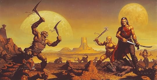 Edgar Rice Burroughs’ Barsoom books and Jack Vance’s Dying Earth are most frequently cited as primary inspirations for Dark Sun. In his famous list of inspirations for D&D as a whole, Appendix N, Gary Gygax lists explicitly lists both. And another work explicitly listed on Appendix N was likely a major inspiration for Dark Sun: Hiero’s Journey by Sterling Lanier. Hiero’s Journey is set in our own post-apocalyptic future, not a secondary world, but it includes many elements in Dark Sun. First and foremost is the prominent role of psionics (although present in the Barsoom books, but to a much smaller degree). The works are dystopian and post-apocalyptic. Each features inventive, bizarre monsters. They share a certain environmentalist moral. The four leg of the stool holding Dark Sun is Brom’s artwork, which gives the dark fantasy world its own distinctive feel.