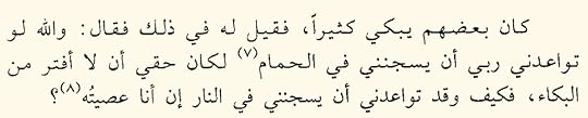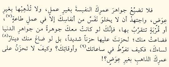 "واعلم رحمك الله أن هذه الدنيا سوق متجر الأبرار وحلبة السباق بين الكرام الأخيار، ومزدرع التقوى ليوم القرار، ومحل تحصيل الزاد للسفر الذي ليس كالأسفار، فبادر رحمك الله قبل فوات إمكان البدار… واغتنم أنفاسك العظيمة المقدار، واذرف من دموعك على ما سلف من تفريطك، فإن قطرة الدموع من خشية الله تعالى تطفئ البحور من النار، وتيقظ في ساعات الأسحار عند نزول الجبار، وأحضر بقلبك قول العزيز الغفار؛ هل من سائل فأعطيه، هل من داعٍ فأستجيب له، هل من مستغفر فاغفر له؟ قل نعم يا رب… أنا…" وصية مختصرة نافعة، رافعة للهمم صوب المعالي، جامعة لما يهم الإنسان في أخراه ودنياه… هذه الوصية محركة للنفوس باعثة للتزكية، موقظة للغافل… وآفكر صدقًا أنه يمكن إعادة قراءتها بين الفينة والأخرى…