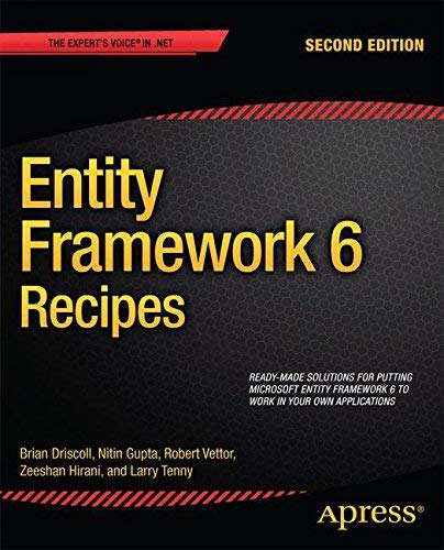 Entity Framework6 Recipes provides an exhaustive collection of ready-to-use code solutions for Entity Framework, Microsoft'smodel-centric, data-access platform for the .NET Framework and ASP.NET development. With this book, you will learn the core concepts of Entity Framework through a broad range of clear and concise solutions to everyday data access tasks. Armed with this experience, you will be ready to dive deep into Entity Framework, experiment with new approaches, and develop ways to solve even the most difficult data access challenges. If you are a developer who likes to learn by example, then this is the right book for you. Gives ready-to-use, real-world recipes to help you with everyday tasks Places strong focus on DbContext and the Code First approach Covers new features such as Asynch Query and Save, Codebased Configuration, Connection Resiliency, Dependency Resolution, and much more What you'll learn Implement basic data access design patterns using Entity Framework. Seamlessly model your solutions across both code and data. Provide data access to Windows 8 and Metro applications. Integrate with WCF Data Services Improve data access performance. Simplify and reduce your code through data binding. Who this book is forEntity Framework 6 Recipes is for anyone learning Microsoft's Entity FrameworkMicrosoft's primary data access platform in the .NET Framework. If you have ever struggled to learn a new technology, programming model, or way of doing something, you know how helpful simple and real-world examples can be. For the beginning developer, this book provides concrete examples for common data access tasks. For developers having experience with previous Microsoft data access platforms, this book provides a task-by-task mapping between previous approaches and the patterns used in Entity Framework. Table of Contents Getting Started with Entity Framework Entity Data Modeling Fundamentals Querying an Entity Data Model Using Entity Framework in ASP.NET Loading Entities and Navigation Properties Beyond the Basics with Modeling and Inheritance Working with Object Services Plain Old CLR Objects Using the Entity Framework in N-Tier Applications Stored Procedures Functions Customizing Entity Framework Objects Improving Performance Concurrency