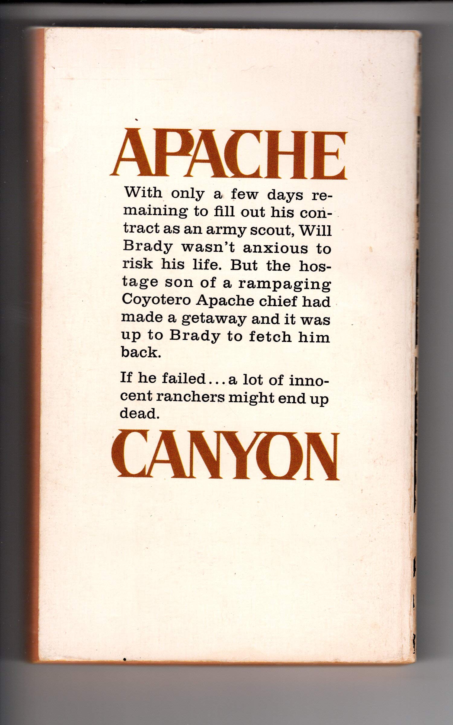I've always enjoyed Brian Garfield's early westerns and APACHE CANYON is no exception. The brutal Arizona desert is nicely developed. The characters are interesting. There is action, a bunch of violence, and even a betrayal. My only beef is that Garfield wrote around a scene -- where a U.S. Cavalry troop was retreating from an Apache war party -- that promised to be terrific. It was likely done to keep the word count within the publisher's limitations, but there was more to the story than is told here and it could have been much better than it is. But it was still a worthwhile escapist read.
