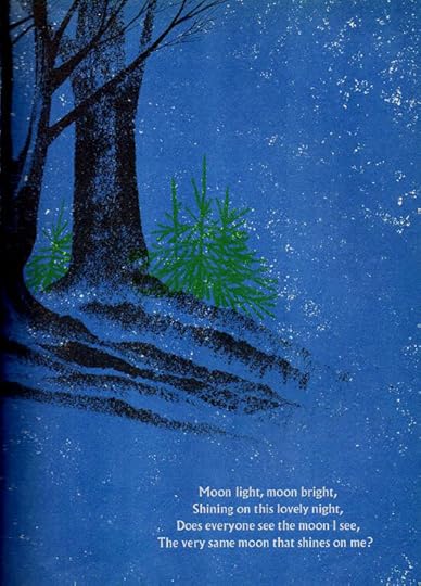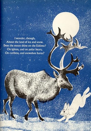 The library sent me the 1996 edition with Barbara Garrison's prints, instead of the original 1969 edition with Leonard Weisgard's illustrations. I'm crushed, frankly. Garrison's are wan and brown and sometimes only occupy a fraction of the page; Weisgard's are deep blue and fill the page: