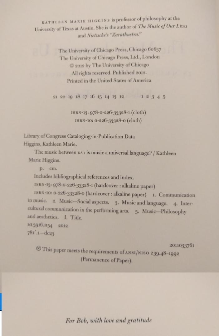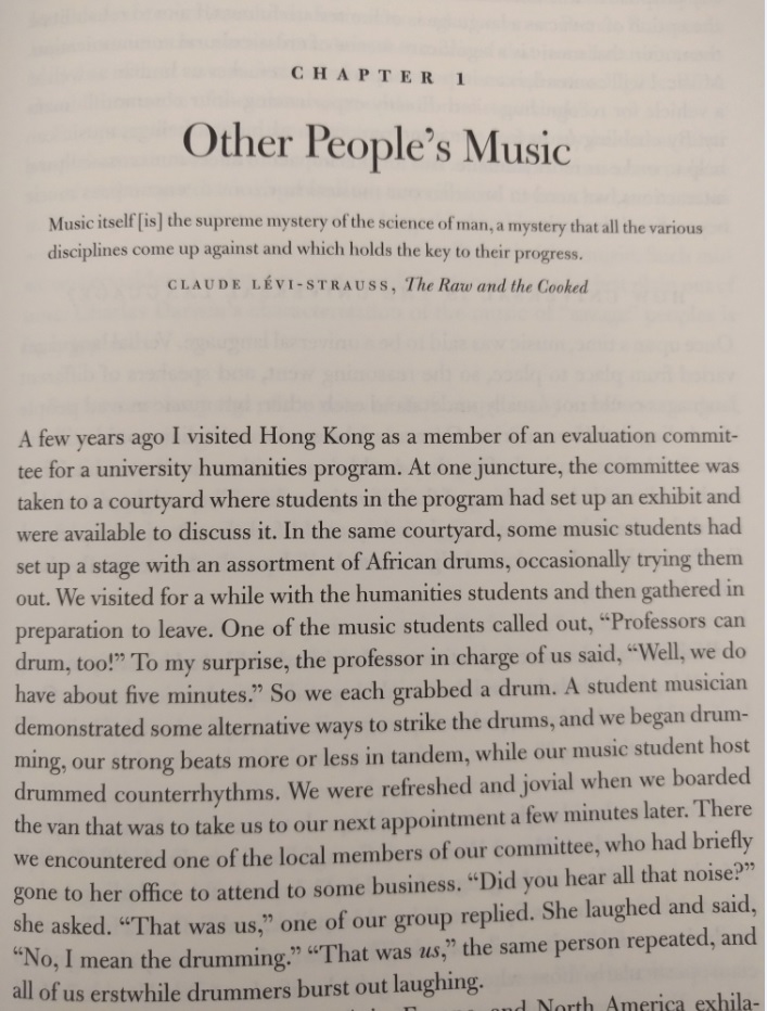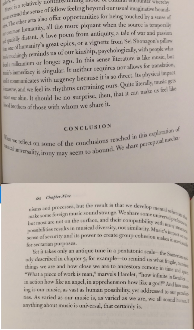 One would not be entirely wrong to go to church for the music if the purpose of going to church is to tune in to what is larger than one’s individual ego. While the qualitative character of the altered sense of self and the doctrinal interpretations of what is involved differ, music’s accomplishment is to attune us with what is beyond ourselves. By building and reinforcing ontological security, music facilitates secure participation in a world with other, fellow beings. What begins in an infant’s sense of being with its mother expands to open-ended spiritual rapport. (157)(Almost a century ago in The Big Money , John Dos Passos has a character say that "unbelief dissolves in music like a lump of sugar in a glass of hot tea.")